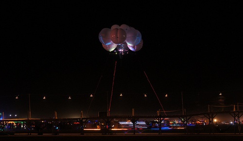 Our camp featured tesla-coil concerts, and there, was, admittedly, high drama before the balloons were successfully fully deployed. Despite some initial setbacks, eventually the camp lifted their payload high into the air. In a city confined to a flat lakebed, the balloons added a third dimension to the playascape.