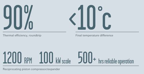“Heat from compression is stored or routed to nearby buildings, providing heating. During expansion, heat is extracted from storage, or buildings providing air conditioning. This dramatically increases building energy efficiency.”