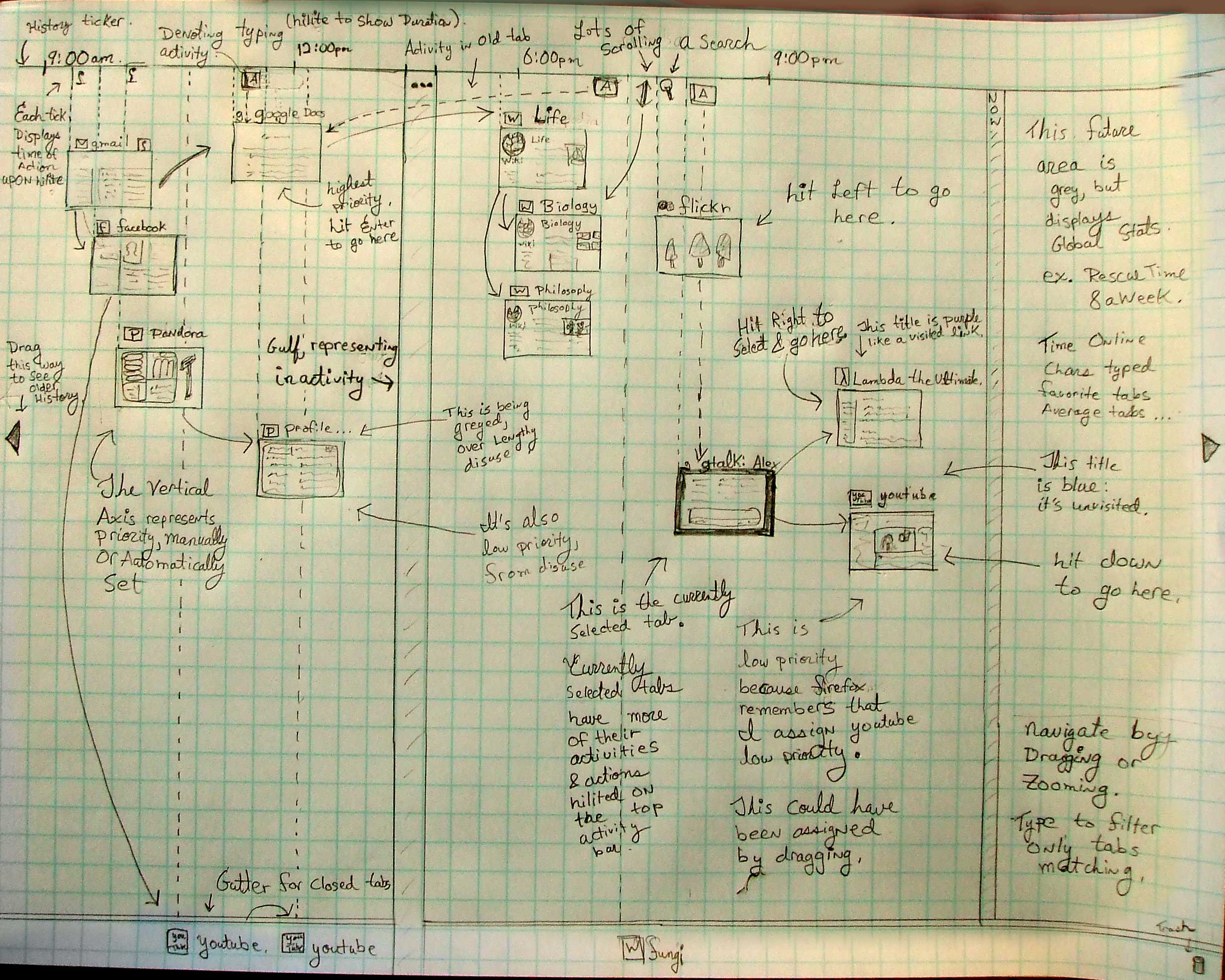 We can show history. Turn the ticker at the top into a lifestream. At each tick, denote the activity by a little icon. Suppose you’ve done a bunch of typing: this is a writing tab, we can represent this with a little ‘key’ icon. Suppose instead that you’ve just scrolled and read: show scroll buttons, up and down. Suppose we’re idle: show an ellipsis. Suppose we open a new tab: show a sprout. Suppose we open a tab in the background, creating another branch: show an arrow branching into two.
